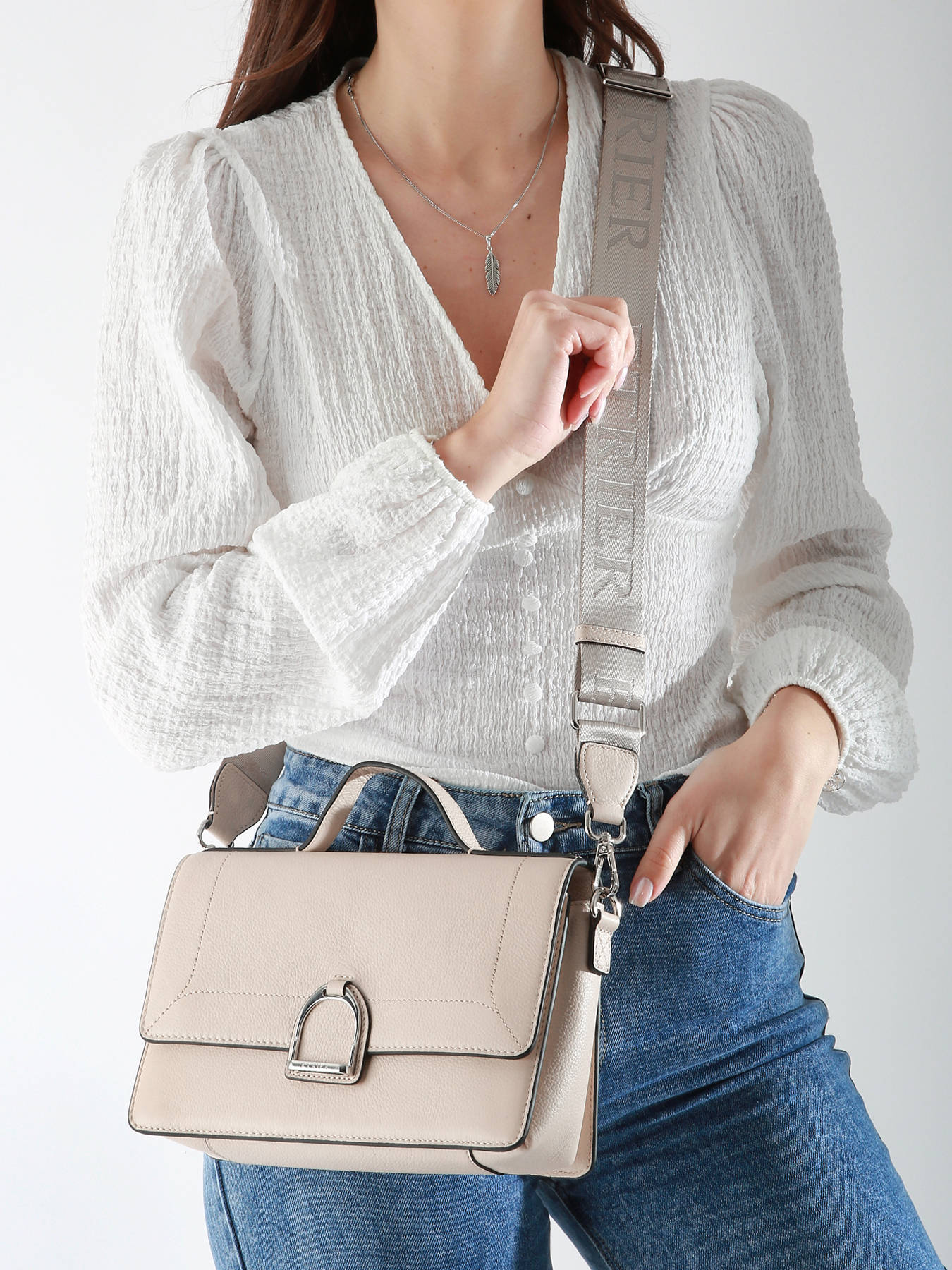 Le sac bandoulière ETRIER de la ligne ALTESSE, en cuir de vachette, se distingue comme le plus grand format de ce modèle. Doté d'une poche à l'arrière et d'une fermeture à rabat orné de l'étrier en métal emblématique de la maison, il se sécurise avec une pression aimantée. Sa anse en cuir et sa large bandoulière amovible en toile brodée du logo ETRIER ton sur ton peut se porter de deux façons différentes. À l'intérieur, vous trouverez deux compartiments comportant deux poches plaquées et une poche éclair, assurant une organisation optimale. Disponible en plusieurs coloris saisonniers et en deux tailles plus petites.
